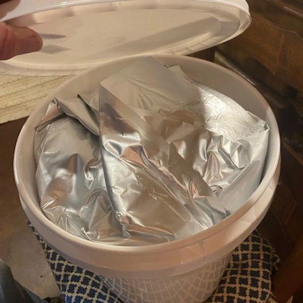 When the top of the bag has cooled, fold over into bucket, and install the lid.